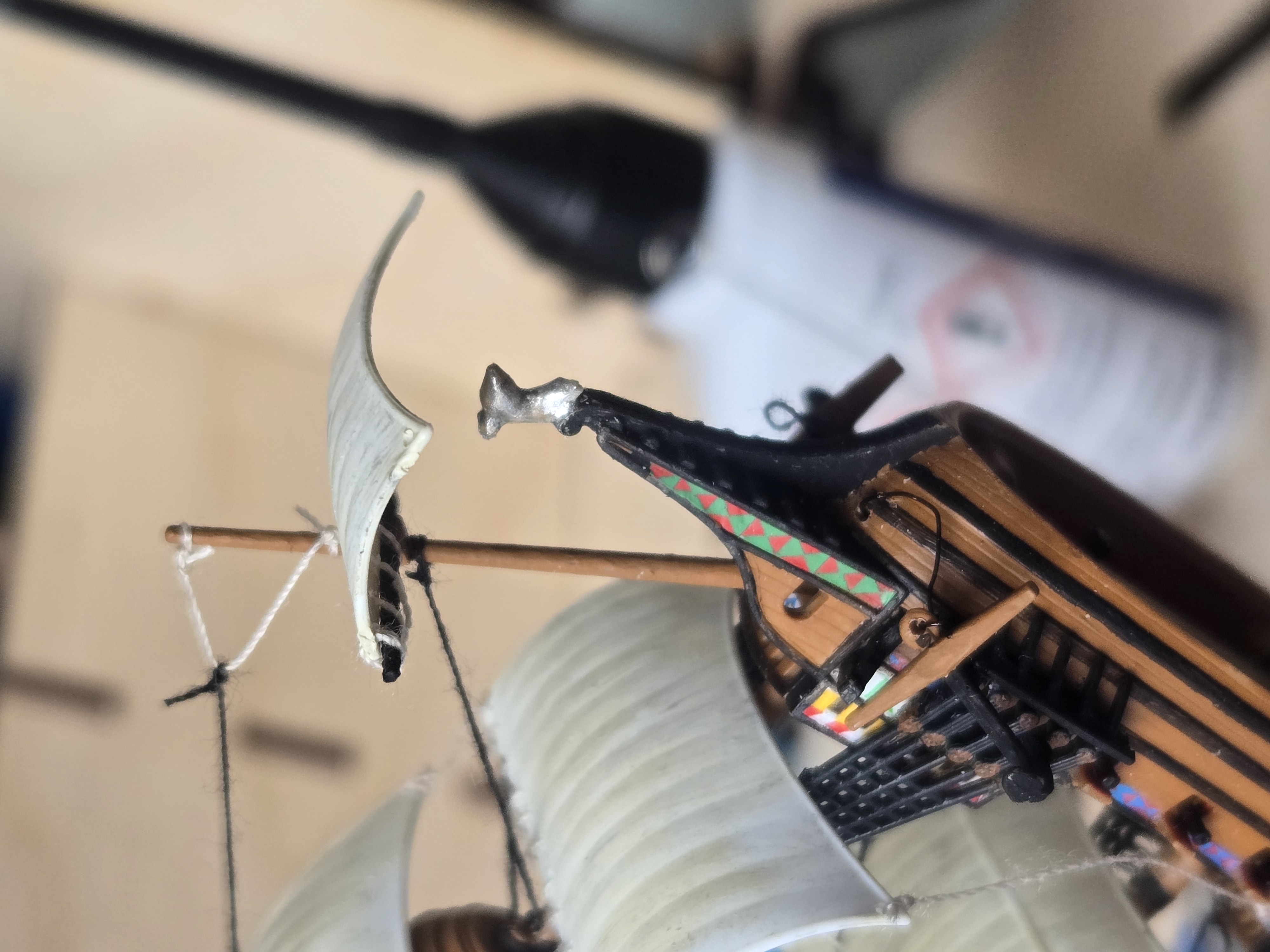Определенная сложность возникла с носовой фигурой в комплекте с таким масштабом не было, поэтому некое подобие было сделано из обрезков литника.