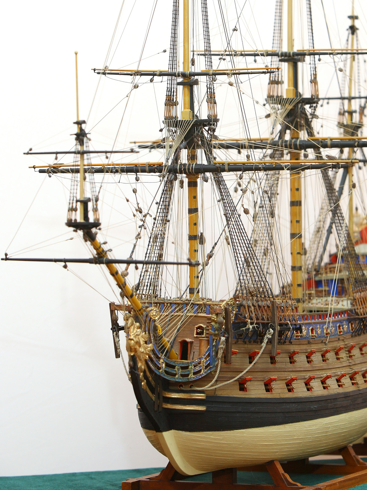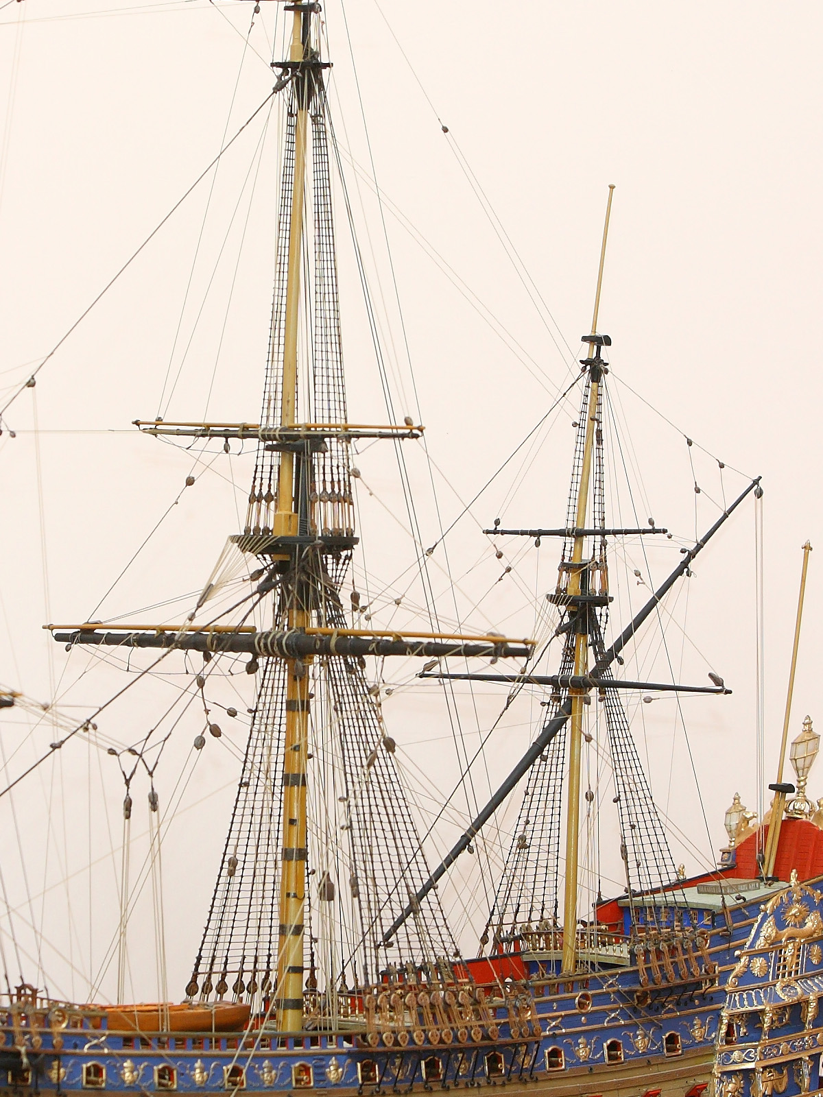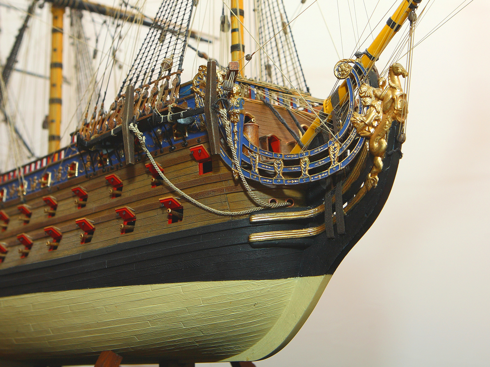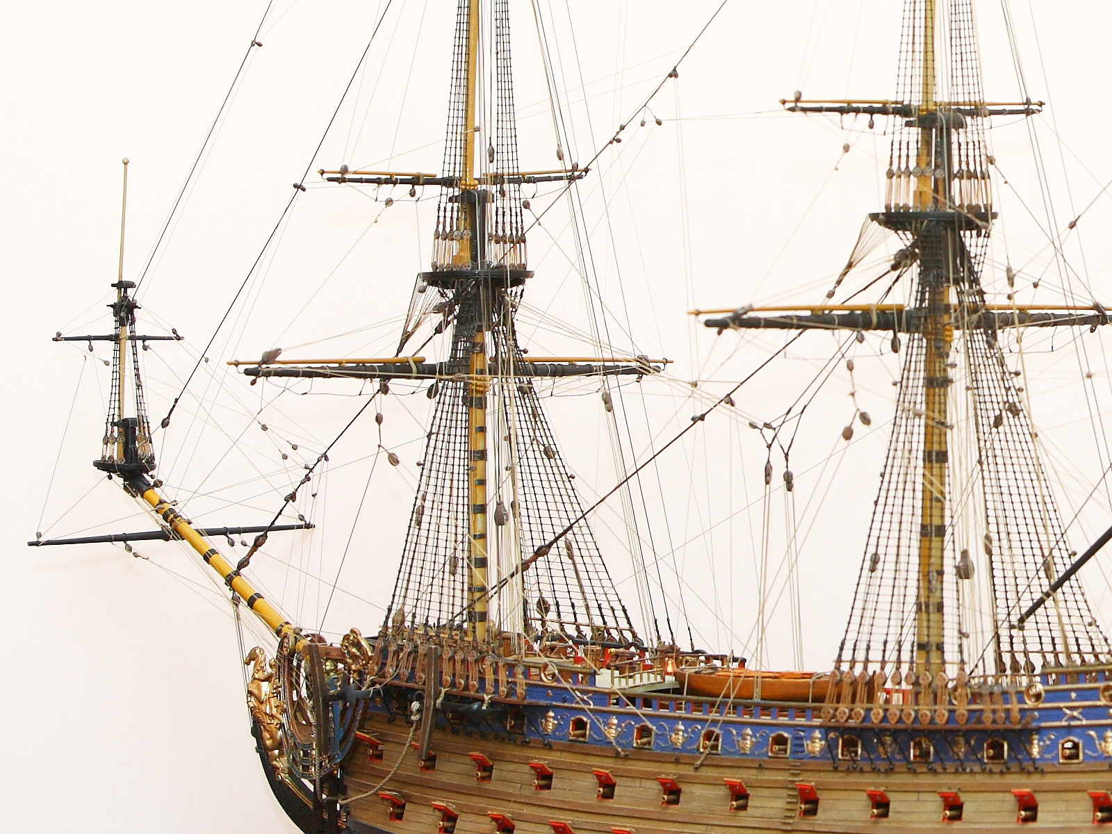 Корпус собран с минимальными переделками: в штульцах прорезана галерея, малая шлюпка перенесена со шканцев на большую шлюпку, срезаны и заменены на самодельные хлипкие нагели. Рангоутные деревья, состоящие из двух половинок (мачты, бушприт, нижние реи) усилены металлическими прутками. Одна деталь на полубаке была утеряна и заменена на деревянную. Какая именно - говорить не буду, попробуйте определить сами.