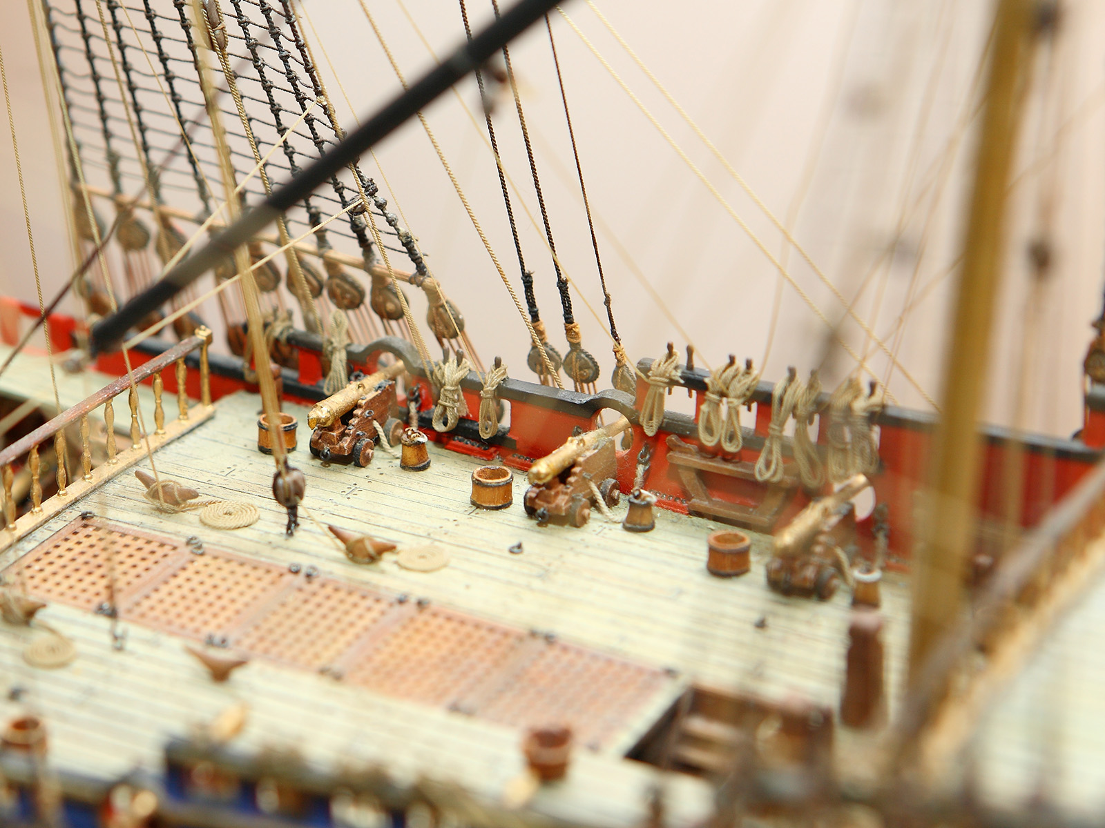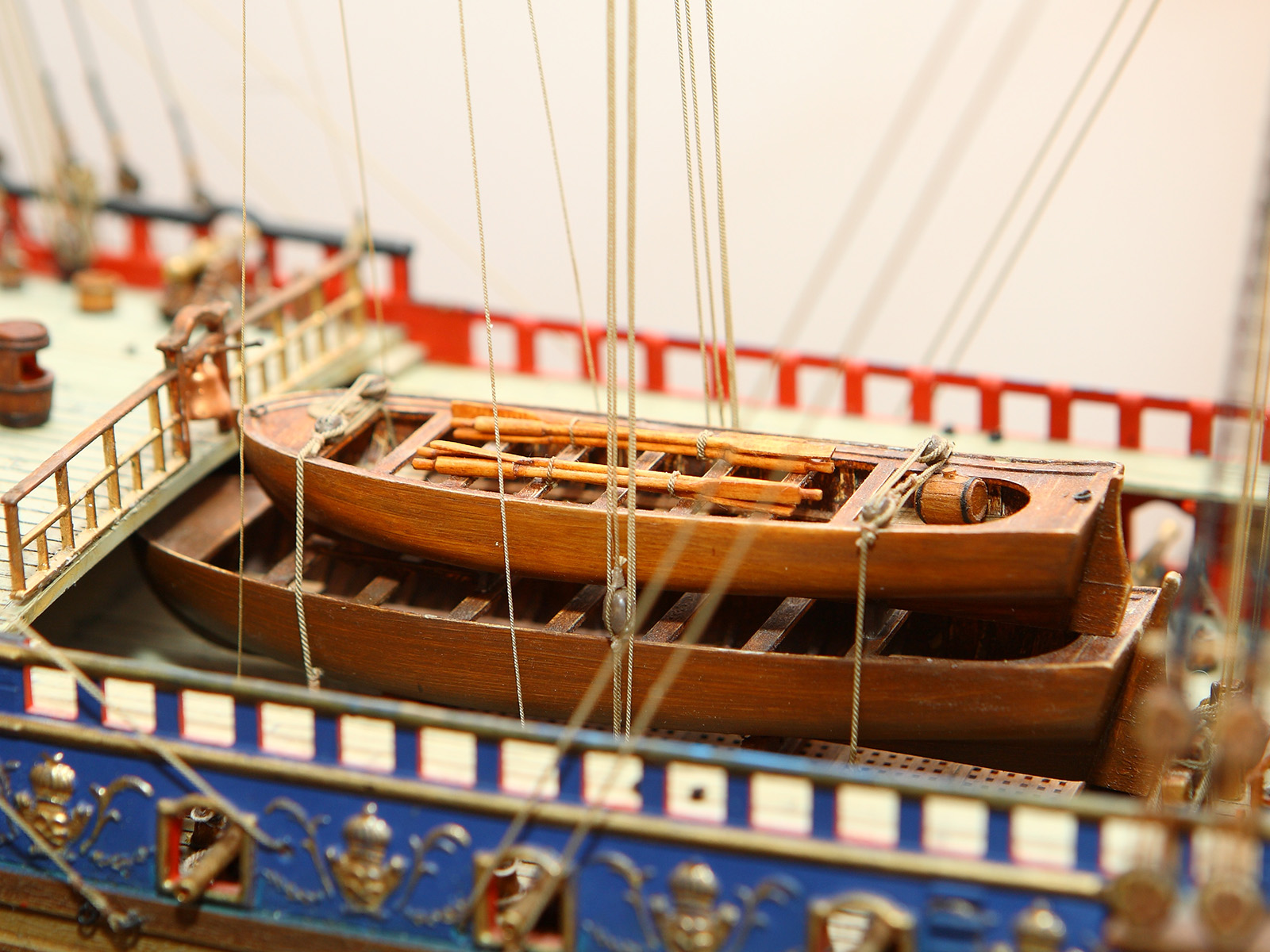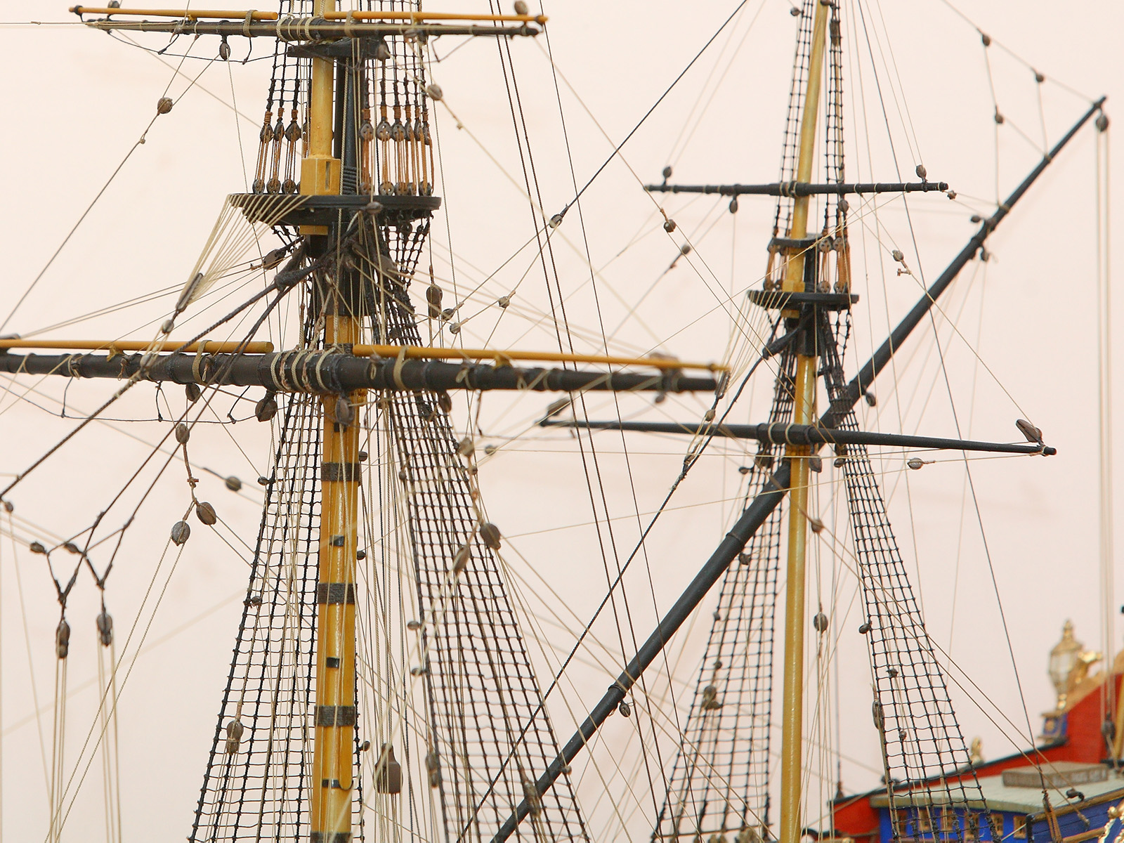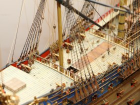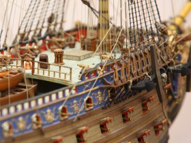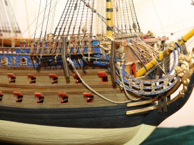 Корпус собран с минимальными переделками: в штульцах прорезана галерея, малая шлюпка перенесена со шканцев на большую шлюпку, срезаны и заменены на самодельные хлипкие нагели. Рангоутные деревья, состоящие из двух половинок (мачты, бушприт, нижние реи) усилены металлическими прутками. Одна деталь на полубаке была утеряна и заменена на деревянную. Какая именно - говорить не буду, попробуйте определить сами.