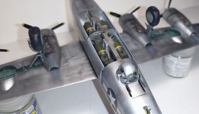 На модели продумано вращение винтов (их можно и снять...для перевозки например...решено все полиуретановыми втулками), так же можно оставить вращающейся верхнюю турель. Нижняя может только менять угол наклона. Носовая и кормовая турели неподвижны. Колеса изображены с продавленными пневматиками, так что они не вращаются.