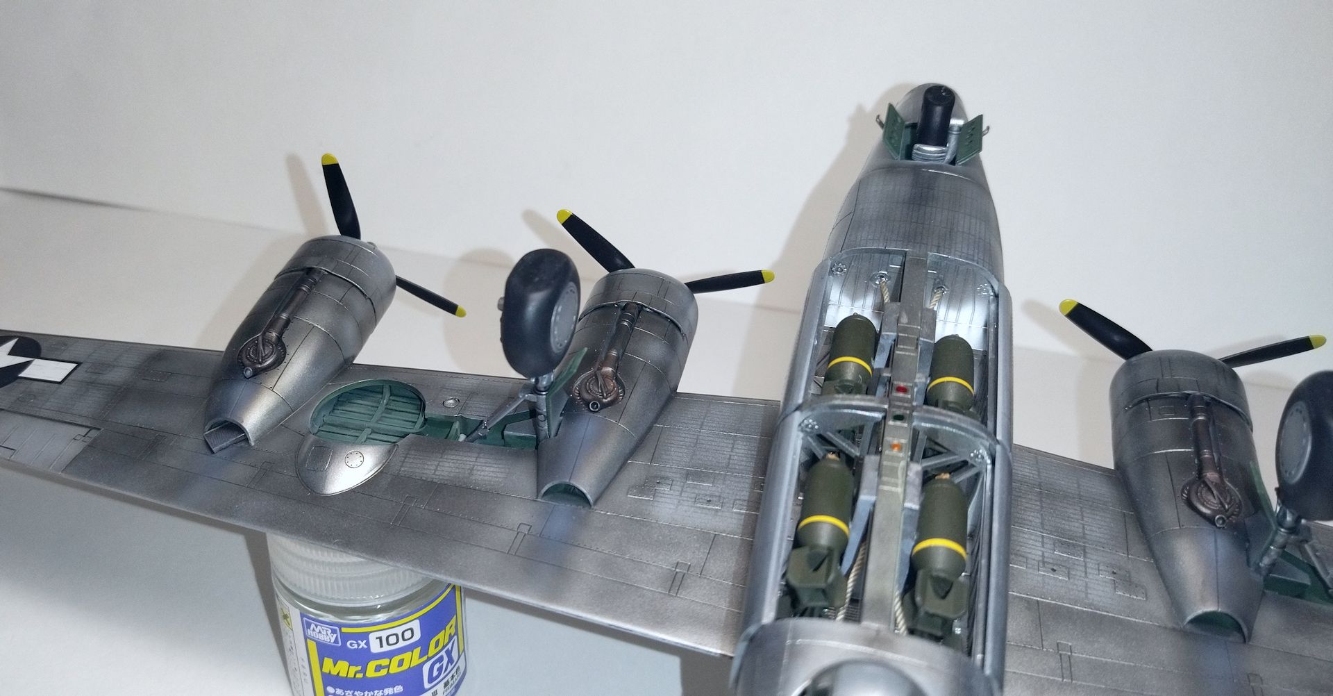 Модель дополнил лишь перемычками в заборниках двигателей, канатами для экипажа в бомбо-отсеке и натяжной антенной. В общем по поводу неё есть сомнения - сделал лишь из за пары фоток и 3Д чертежа. Вид правда повеселее с ними)... В общем и с мачтами других антенн путаница. Но состав радиооборудования постоянно менялся. Поэтому оставил так, как сделал. В общем из соображений визуального эффекта накрасил и ПОС по кромкам. Они кое где были, а кое где и нет. Вроде зависело от региона. Тихий океан - место теплое, а наш самолет как бы с того ТВД. И еще рассверлил трубы выхлопа.