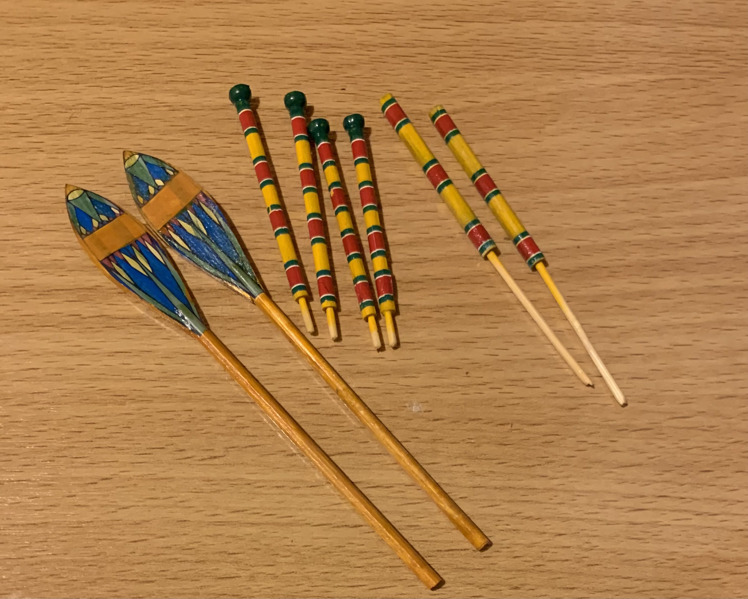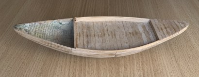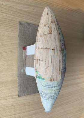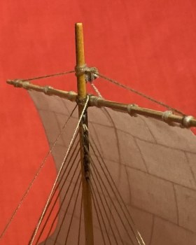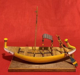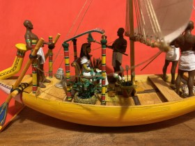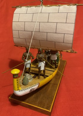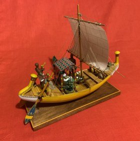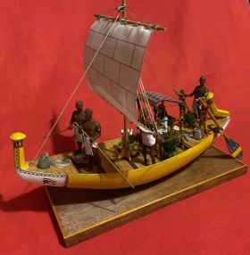 В гробнице сановника Макетре и гробнице фараона Тутанхамона было найдено множество моделей египетских судов. Да и не только там - что ни гробница, то роспись на стене с кораблем или модель. Захотелось сделать аналог такой модели, причем с фигурками людей, то есть так, как и на моделях того же "моделиста" Мекетре. Для фигурок египтян были подобраны "солдатики" фирмы Silver Dream Studio: сидящая в кресле знатная дама (переделке не подвергалась, и четыре опахалоносца, позы которых и инвентарь были несколько изменены. Корпус из палочек-мешалок для кофе на пластилиновой основе с проклейкой из папье-маше. Для лепки отдельных деталей, например, лотосов в корзине, использовалась полимерная глина. Носовое и кормовое украшения были сначала вылеплены из пластилина парными деталями, затем с них сняты парафиновые формы, в которых была залита эпоксидная смола. Готовые половинки были склеены и обточены. Окраска - акриловые краски. Декорирование все окрашенных деталей - только при помощи декалей, сделанных на заказ. Рисунок на парусе - термопечать. Корзины связала жена. Самое интересное - мачта. В ней египтяне делали пропил в верхней части и вставляли в него вращающиеся блоки. Пришлось также пропилить мачту и вставить кружочки от палочки для шашлычков, только они не вращаются...